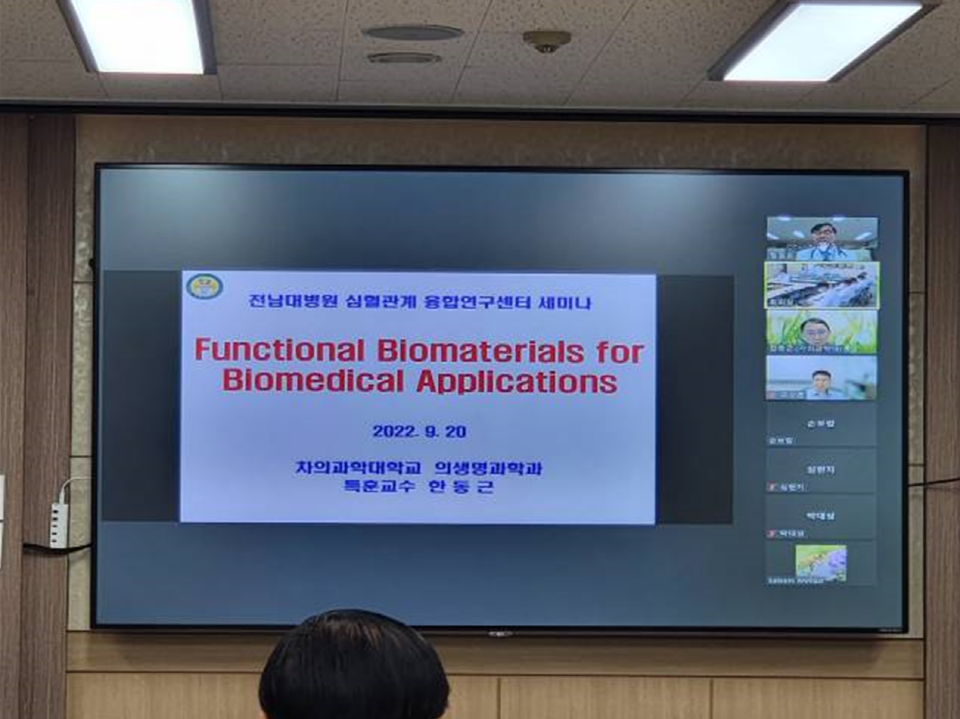 오늘 개최된 초청 특강에서 차의과학 대학교 의생명과학과 특훈교수 한동근 박사님께서 'Functional Biomaterials for Biomedical Applications' 에 관하여 화상으로 명강의해 주셨습니다.
