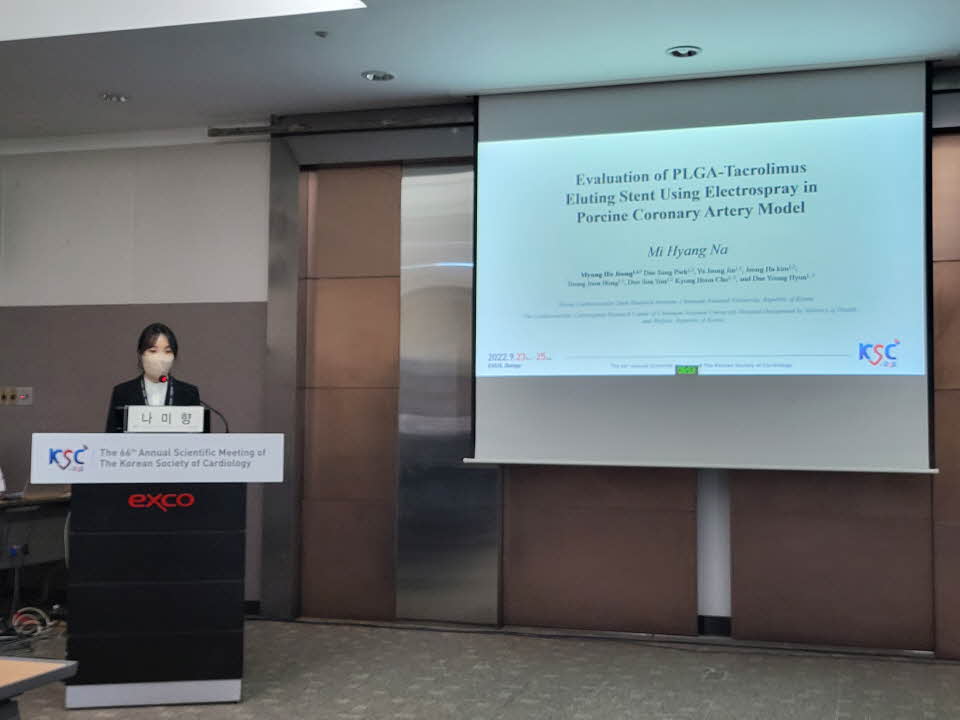 대한심장학회 추계 학술 대회에서 나미향 선생님께서 'Evaluation of PLGA-Tacrolimus Eluting Stent Using Electrospray in Porcine Coronary Artery Model' 이라는 흥미로운 주제로 발표 진행하여 주셨습니다.