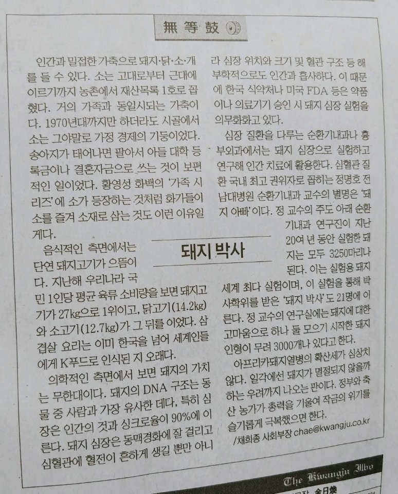 아프리카 돼지 열병에 관한 일간지 기사 '무등고'에 제 돼지 심장실험연구가 소개되었습니다. 돼지 덕분에 심장병 환자들을 위한 연구를 할 수 있었습니다. 조속히 돼지 열병이 퇴치되길 기원합니다.