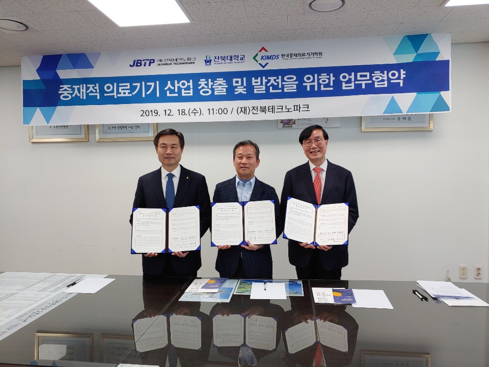 오늘 전북테크노파크에서 강신재 원장님, 김동원 전북대 총장님과 한국중재의료기기학회가 의료기기 산업 창출 및 발전을 위한 업무협약 MOU 를 체결하였습니다.
