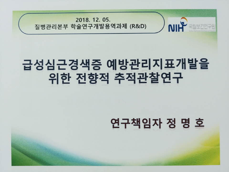 오늘은 서울에서 KAMIR-NIH 연구 최종평가를 받게 됩니다. 2011년부터 13,000명의 AMI 환자를 등록하여 3년 FU 98.5%의 세계최고수준의 AMI cohort 를 만들었습니다. 그 동안 후원해 주신 모든 분들께 진심으로 감사드립니다.