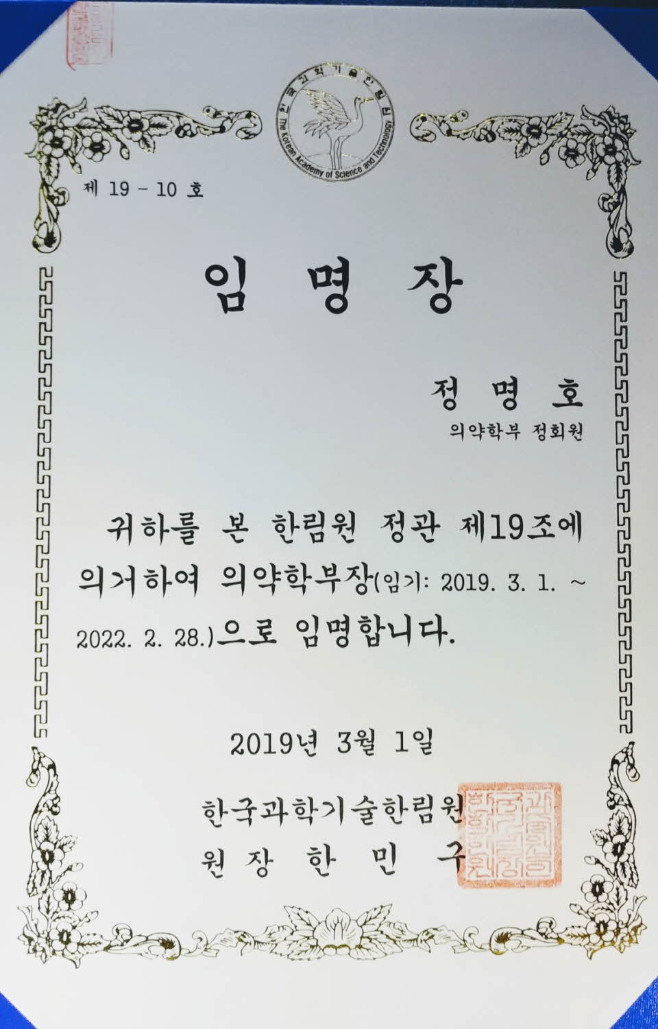귀하를 본 한림원 정관 제19조에 의거하여 의약학부장(임기: 2019. 3. 1 ~ 2022. 2. 28)으로 임명합니다.