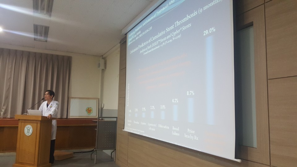 일시: 2017년 8월 22일 오후 5시 장소: 전남대학교 의대 1호관 5층 회의실 연자: 전남대학교병원 심도자실 김인수교수님 강연내용: 심장혈관 스텐트 시술 후에 발생한 재협착 및 혈전에 대한 임상자료를 발표해 주셨습니다.