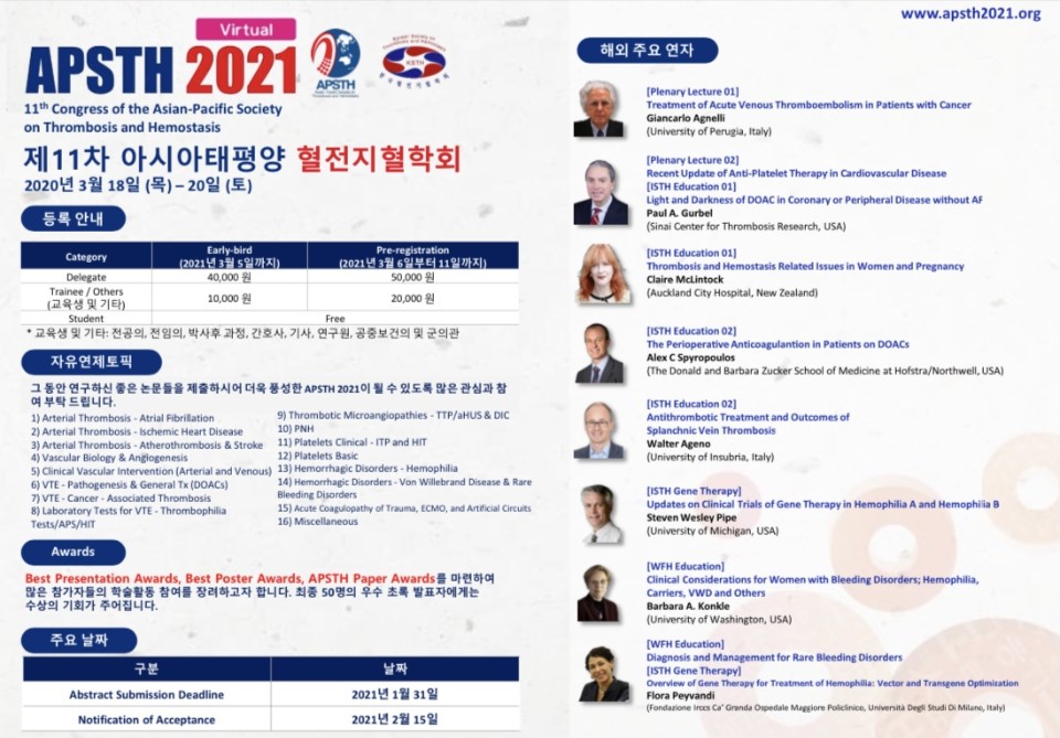 APSTH 2021 제 11차 아시아 태평양 혈전지혈학회 2020년 3월 18일 (목) ~ 20일 (토)