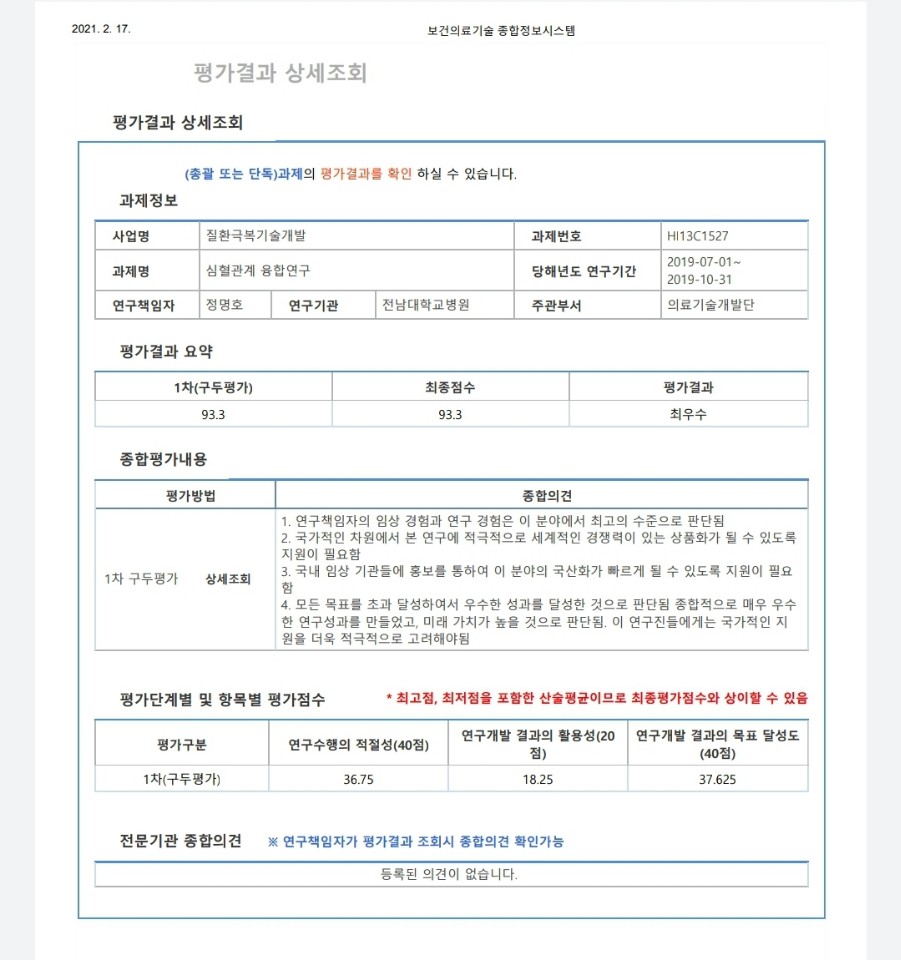 심혈관계 융합연구센터 최종평가에서 93.3 점으로 최우수 평가를 받았습니다. 그 동안 후원해 주신 은혜에 진심으로 감사드립니다.