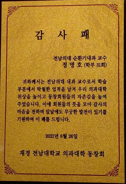 재경 감사패 전남의대 순환기내과 교수 정명호 (학부 31회) 2021년 6월 26일 재경 전남대학교 의과대학 동창회