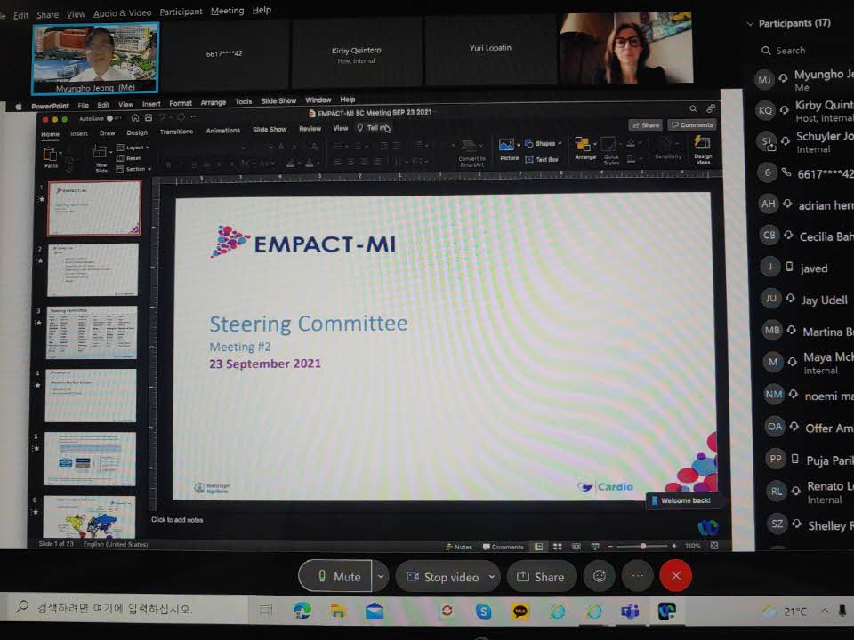 일시: 9월 23일 (목) 오후 8:00~ 회의: 국제 화상회의 심근경색증 후에 발생하는 허혈성 심부전증 환자를 대상으로 진행하는 EMPACT-MI 국제임상 연구에 한국을 대표하여 국제화상회의에 참여하고 있습니다.