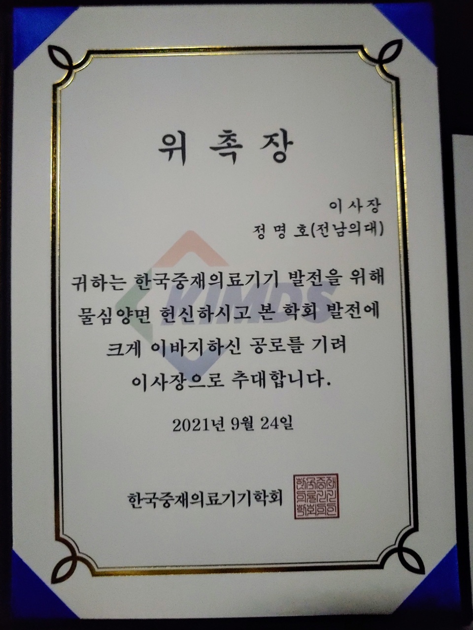 한국중재의료기기학회 이사장 위촉장 일시: 2021년 9월 24일 (금) 장소: 서울 세종 대학교 정명호 교수님 한국중재의료기기학회 이사장 추천을 진심으로 축하드립니다.