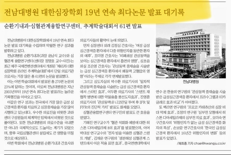 전남대병원 대한심장학회 19년 연속 최다논문 발표 대기록